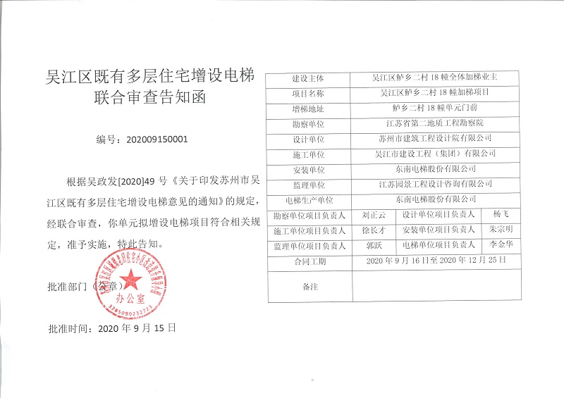 為更好地服務于吳江區既有多層住宅增設電梯工作,根據《蘇州市吳江區既有多層住宅增設電梯實施意見》及《吳江區既有多層住宅增設電梯聯合審查試行辦法》精神,我司積極響應政策要求參與其中。由區住建局牽頭組織專家小組對參建單位資格等方面進行審查、并向社會公示,形成推薦單位,我司成功入圍電梯加裝單位。
