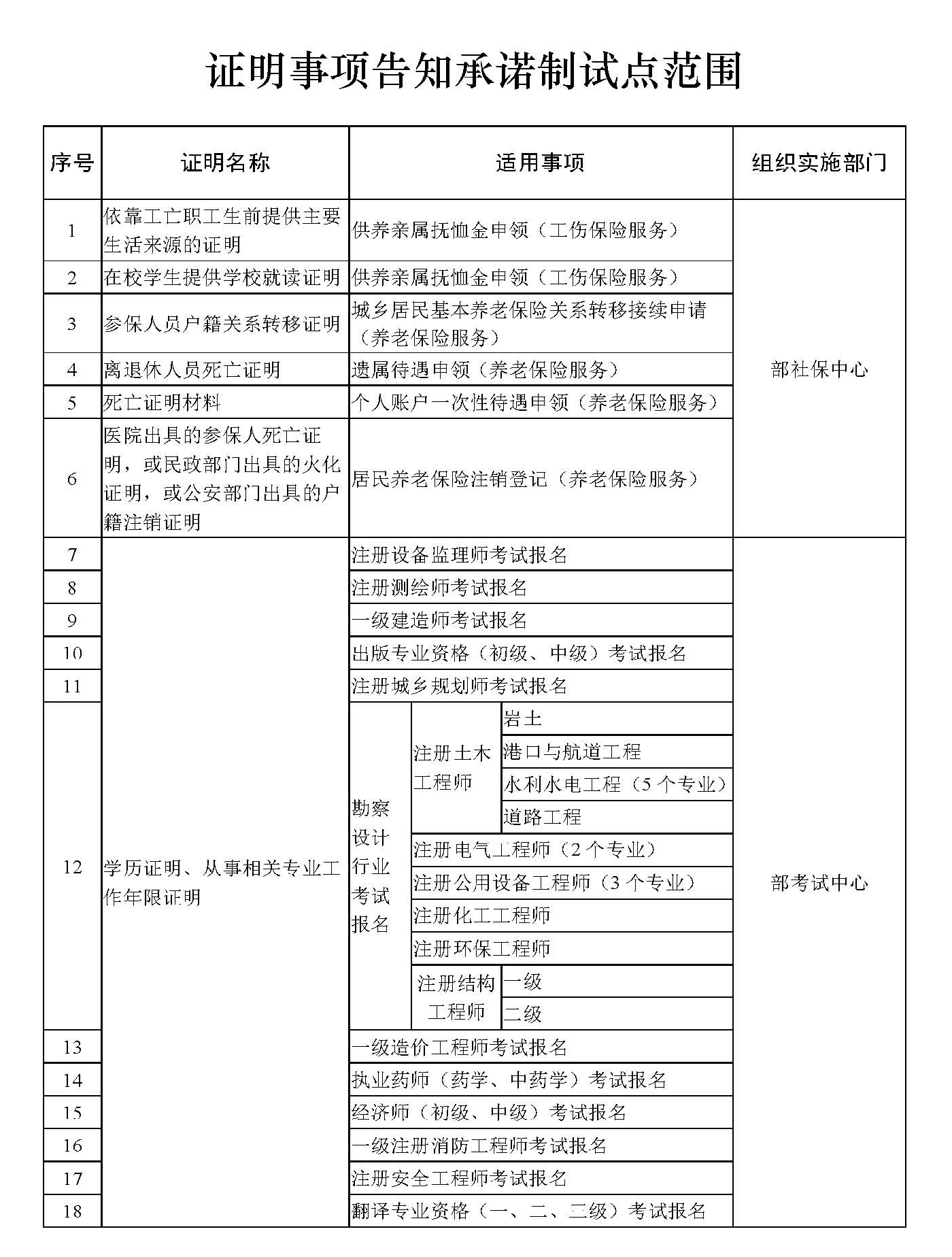 根據現有工作基礎,確定在6項社會保險經辦業務和12項專業技術人員資格考試報名中開展證明事項告知承諾制試點(詳見附件)。
