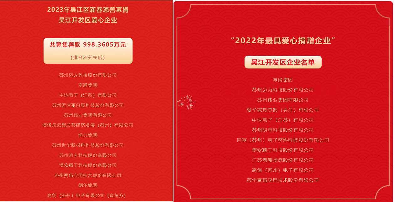 同心協力,愛心捐贈又一年。2022年12月28日,吳江區召開設區十周年大會暨新春座談會。2012年10月,吳江撤市設區,全面融入蘇州主城區;2019年11月,吳江全域納入長三角生態綠色一體化發展示范區。開放帶來更多競爭,本地企業有限市場空間被擠壓,集團于夾縫中求生存,克服千難萬難求發展,勇于創新、勇于奉獻,集團領導在本次活動中捐款100萬元,企業被評為“吳江區2022年最具愛心捐贈企業”、“2023年吳江區新春慈善募捐吳江開發區愛心企業”。